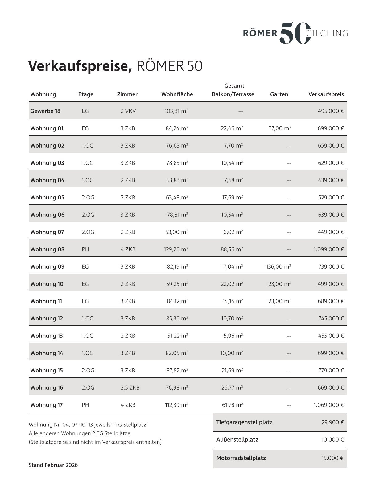 Die folgende Übersicht zeigt Ihnen alle verfügbaren Einheiten im Projekt RÖMER 50 auf einen Blick. Wohnflächen, Zimmeranzahl, Außenbereiche und Kaufpreise sind transparent dargestellt, sodass Sie ein direktes Gefühl für Größen, Ausstattungsumfang und Preisstruktur erhalten.